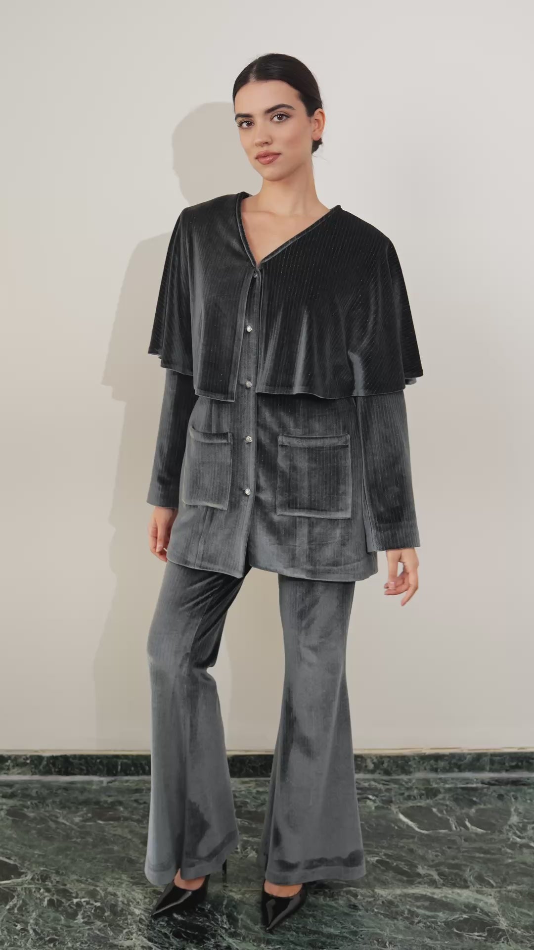 Tailored in lustrous silver-grey velvet, with Cubic Zircon button, Luna merges structure and sensuality in a sculptural silhouette.